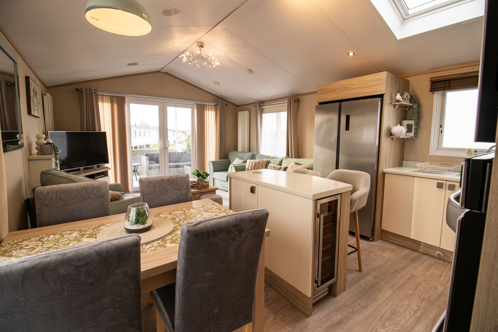 A spacious side entrance hall leads to the open plan lounge, dining, kitchen having freestanding sofa bed and armchairs, electric fireplace, floor to ceiling radiators, Smart TV, DVD player and sliding doors leading from the lounge to spacious glass fronted, south facing decking area.