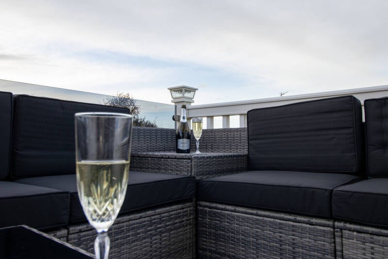 Outside offers gated, wrap around decking, with glass panelling to front and side seating areas, offering perfect spaces for relaxing and enjoying the better weather. Off the lounge is a corner sofa and to the side decking is a dining area for six.